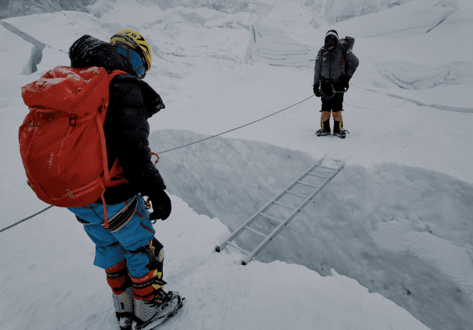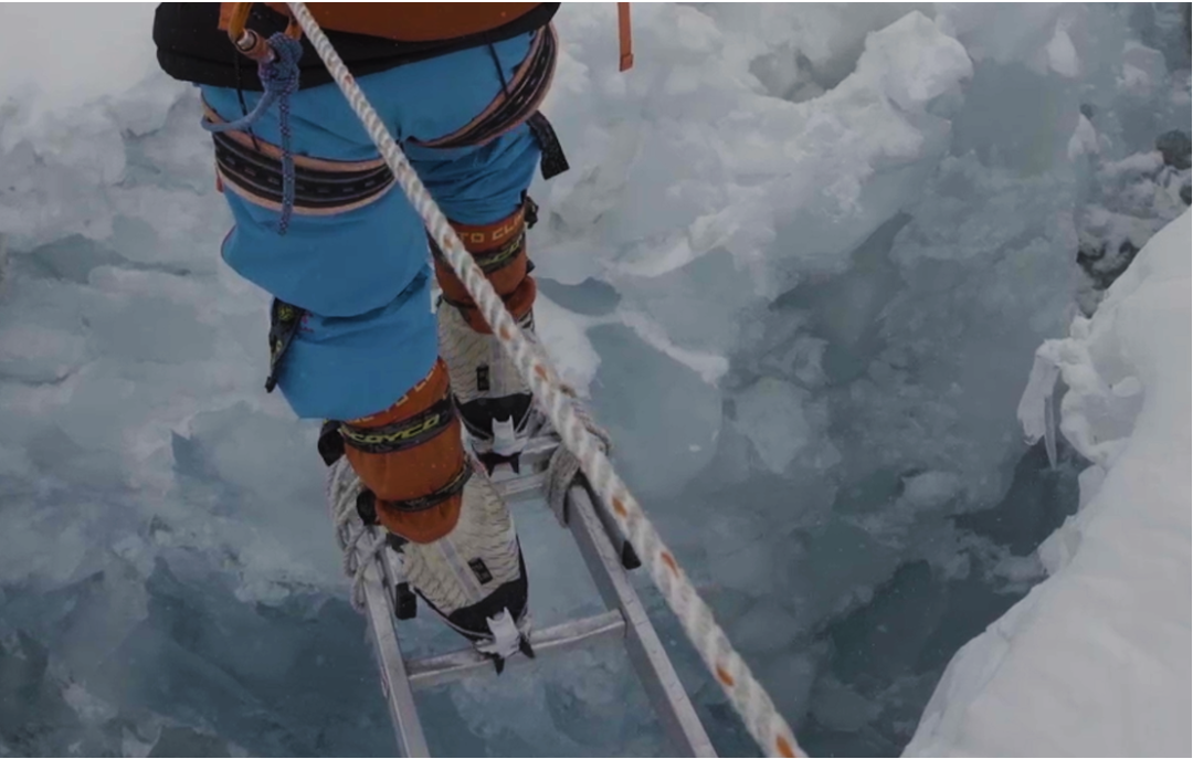 我們要通過架在冰裂縫上面的橫梯,難度更大,因為有些冰裂縫是超過一米多的,這就需要一種特製的梯子,長約兩米。有些更寬的冰裂縫需要兩個甚至三個梯子連接起來,跨度一大,中間就會不斷搖晃,兩邊也沒有欄杆。