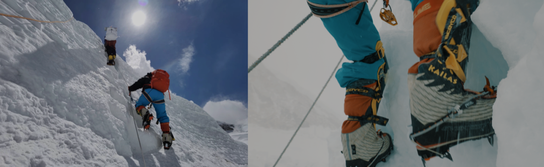 這種梯子寬度剛好放下兩隻腳掌,兩根橫樑也是剛剛卡在冰爪前後的兩個齒縫間,這就要求你跨出的每一步都必須準確無誤,落腳稍微有偏差或者是跨步過大過小,哪怕只是一釐米,就可能有非常嚴重的後果。