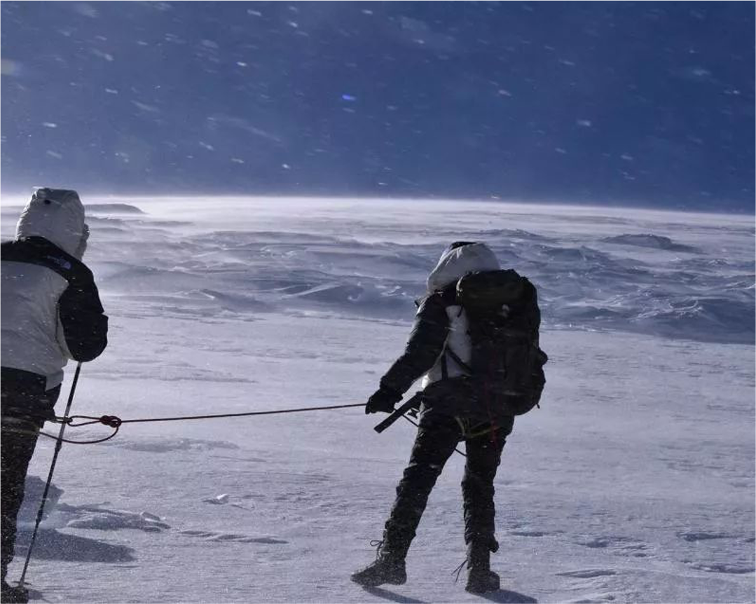 狂風夾帶着冰塊和碎石塊形成了一道阻力,我們根本沒辦法站起來,只能彎腰一步一步向前挪,根本無法直立,每走幾步都得停下來休息調整好久。我好像感覺到有人把手從我嘴巴里伸到我的胸腔,一定要生拉硬拽地把我的心和肺給拽出來一樣。