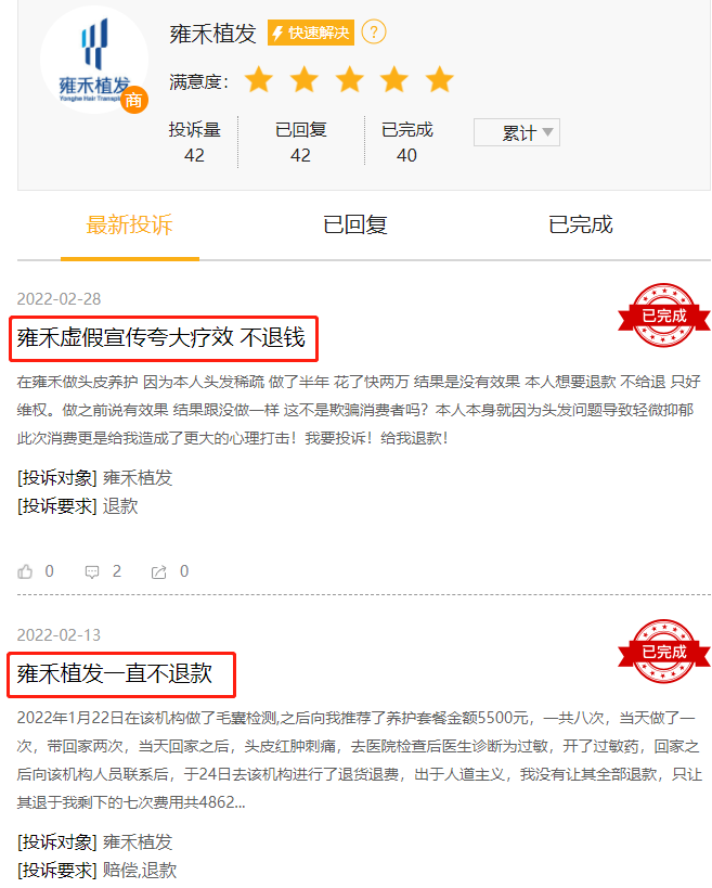 黑貓投訴顯示,2020年10月至2021年2月,關於“雍禾植髮”的投訴一共17條,其中有9條與虛假宣傳有關。