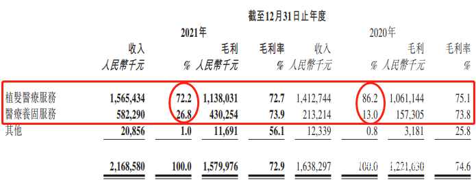 相對雍禾發展最早、佔比較高的植髮業務,醫療養固服務業務2021年收入為5.82億元,較上年增加173.1%。營收佔比從2020年的13.0%上升到26.8%,為雍禾營收增長創造了更多新增量。