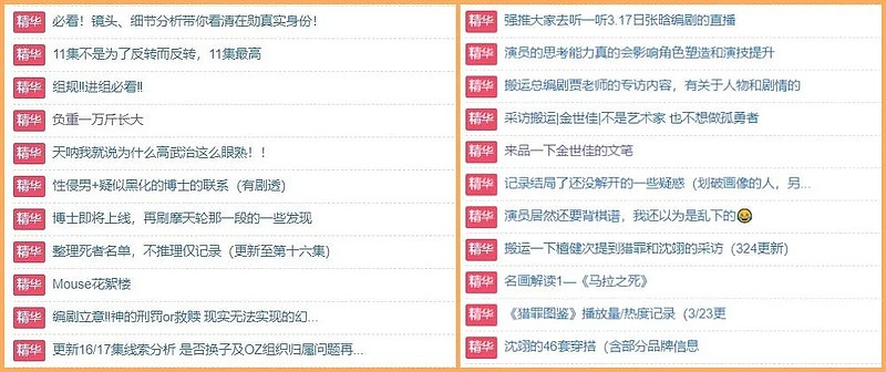 這從豆瓣同名小組的帖子也能看出來。小組“精華討論”並不是根據現有信息推理最後兇手,或者做案件細節推演,而是討論劇情的現實意義與台詞的精彩,“最熱討論”更是圍繞該劇“嗑學”進行討論。對比另一部強推理的《窺探》,組員更多的是在通過表演細節和故事透露的信息來推導結果。