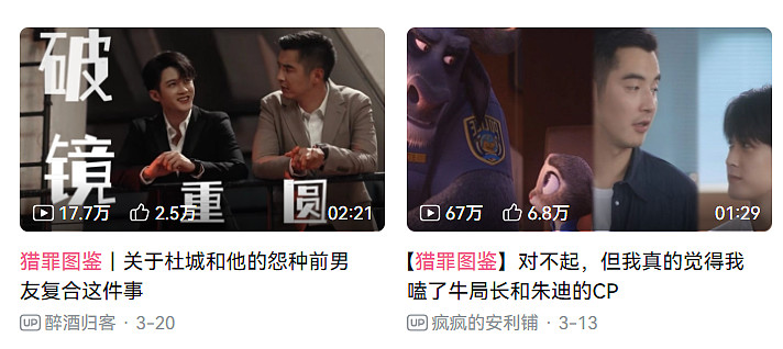 而這部劇最終女性用户佔比也達到了57%,在彼時是懸疑劇少有的數字。2020年的《民國奇探》女性用户佔比更是高達70%,兩位男主熱度攀升,如今二搭的探案作《民國大偵探》已經殺青。《獵罪圖鑑》中兩位男主也讓網友們嗑起了“貓狗CP”。
