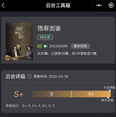 在雲合數據的評級裏,這部平台評級在A級左右的劇,做出了S+級劇的熱度。《獵罪圖鑑》總編劇賈東巖後來在採訪中表示,這個熱度在市場預期之外,但在他自己的預期之內。