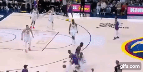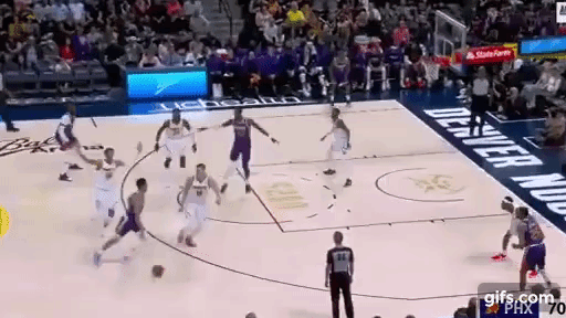 第二節掘金使出近來的殺手鐧:考辛斯+海蘭德。考辛斯展示才藝,**海蘭德暴力提速。**掘金防守驟然施壓,第二節過半已經反超。於是太陽又只能靠布克稍微維持一下的樣子:艾頓牽走約基奇到弱側,布克單挑打約基奇補防不及。