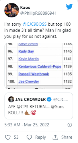 不是我説的,克洛德説的。今天他投中三分球總數進了NBA史上前一百,自己在推特上誇保羅。