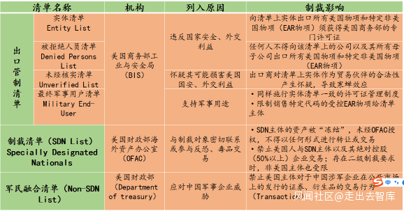 美國的出口管制主要通過各種“黑名單”進行限制,彙總如下: