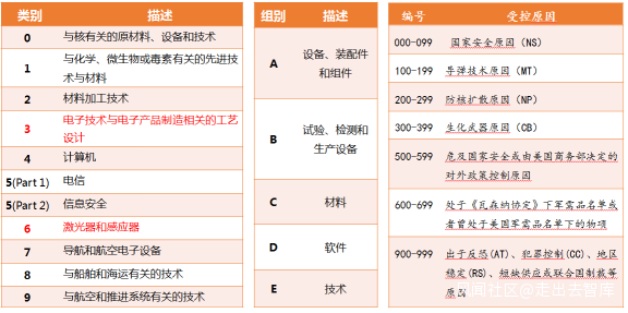 具體而言,美國商務部工業和安全局(BIS)通過“商業控制清單”( CCL)規定每個受控產品的“出口管制分類編碼”(ECCN),根據某物項的ECCN可確定其“受控原因”,將受控原因與“商業國家圖表”(CCC)進行交叉比對後,即可確定該物項出口至某國家是否需要許可證。ECCN編碼的構成要素如下: