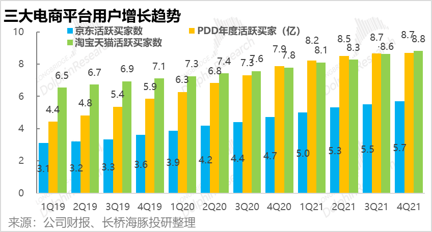 2020Q4,拼多多年度活躍買家數量超過了淘寶,打破了穩定多年的電商格局,一度被看做電商新時代的到來。但僅維持了一年,拼多多又被淘寶反超。2021Q4拼多多活躍買家數為8.7億,環比淨增約100萬,而同季度淘寶和京東的環比淨增均達到了2000萬左右,拼多多的增長似乎已經“見頂”。