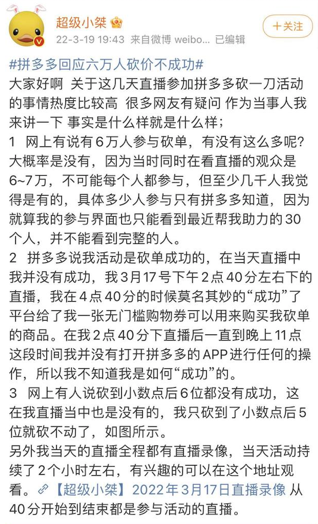 3月17日晚,一名遊戲主播在直播中參與了拼多多砍價免費領手機活動。據當事人稱,當天直播間在線人數為6萬餘人,在直播間、私域粉絲的助力下歷時兩個小時,最終砍到小數點後5位也未能成功砍下手機。