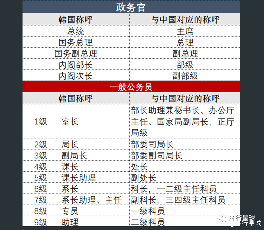 韓國公務員分政務官和一般公務員兩大體系,政務官是次長以上高級官員,共5級,一般公務員是室長以下,共9級。