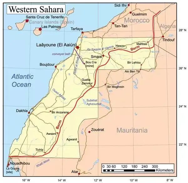 西撒哈拉原為西班牙海外殖民地,1975年,西班牙軍隊自這裏撤出,北方的摩洛哥王國隨即出兵試圖佔領這一地區,而當地本土民族解放武裝波利薩里奧陣線立即反擊,雙方爆發局部戰爭。1991年,雙方在聯合國斡旋下勉強達成停火協議,當前摩洛哥控制着這一地區大約80%的土地,波利薩里奧陣線則據有餘下的約20%。