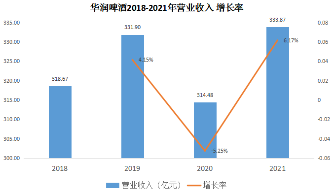 根據財報,華潤啤酒2021年的綜合營業額為333.87億元,同比2020年的314.48億增長6.2%;但與2019年的331.90億基本持平。