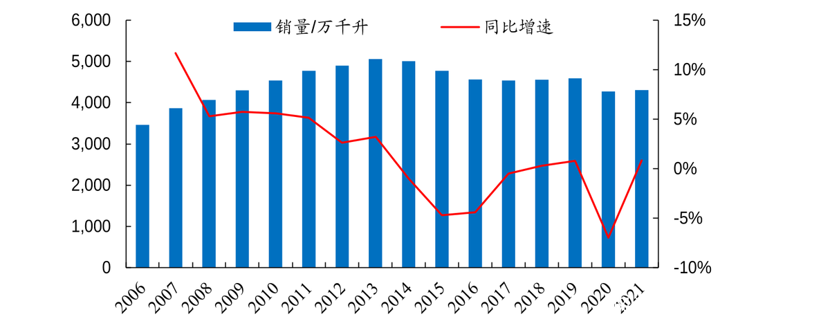 根據鰲頭財經數據,2005年起我國啤酒行業處於快速增長階段,2013年行業規模達到頂峯,產銷量突破5000萬千升。隨後,由於適齡消費羣體人數減少和產品同質化,行業競爭加劇,啤酒總產量下降趨勢明顯,銷量相對穩定。