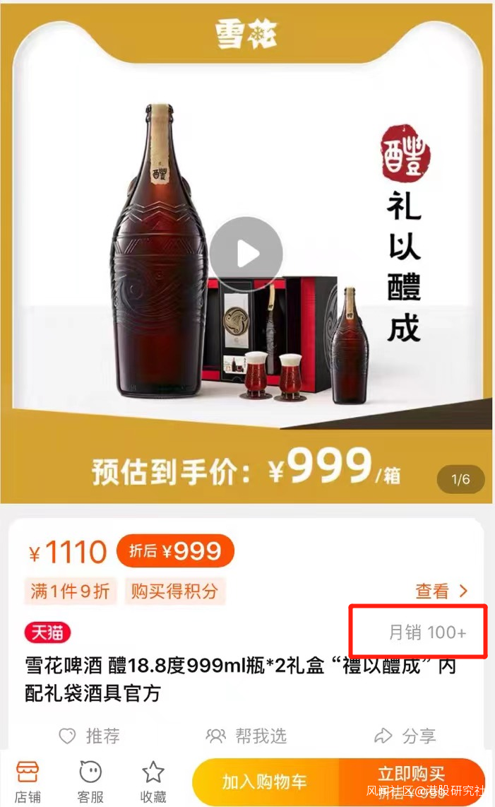 最後,超高端啤酒受限於保存日期,難以成為高端白酒、紅酒。比如:華潤啤酒去年推出的超高端酒“醴”在天貓銷量並不算高,青島啤酒的一世傳奇和百威的精釀大師傳奇虎年限量版同樣營銷大於銷量。
