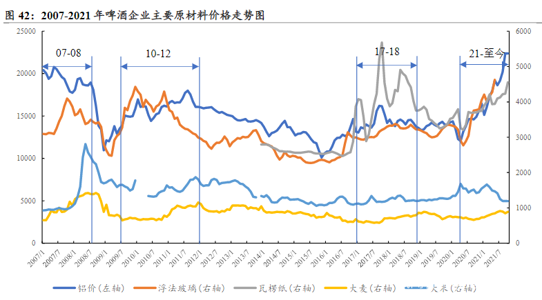 根據東北證券統計,2021年以來,啤酒主要原材料中鋁、浮法玻璃、瓦楞紙價格大幅上漲,大麥價格也有所上升。