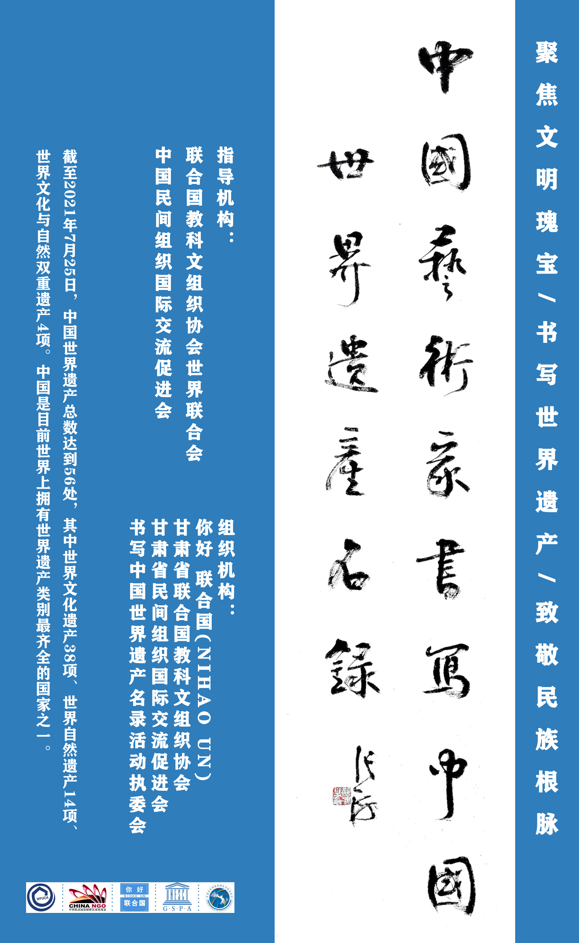經過數月以來選題、策劃、徵選和籌備,截至2022年2月7日,由全國各界56位藝術家傾情參與的“中國藝術家書寫中國世界遺產活動”已全部完成作品創作,於近日正式啓動在線展出。本次活動開展以來,先後得到了聯合國教科文組織協會世界聯合會、中國民間組織國際交流促進會等單位的指導與支持。活動以“聚焦文明瑰寶 書寫世界遺產 致敬民族根脈”為主題,通過各領域代表人士用書法書寫中國世界遺產名錄並舉辦展覽展示的方式,引起社會各界對《保護世界文化和自然遺產公約》的重視,傳播和傳承中華優秀傳統文化,為保護好中國的世界遺產做出積極表率和有力倡議。隨着線上展出活動的有序推進,組委會將擇機在56處世界遺產地舉行為期一年的巡迴展覽活動,為世界遺產保護貢獻中國智慧和中國力量。