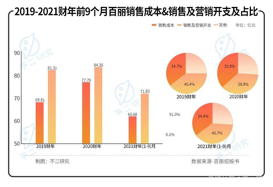 2019-2020財年及2021財年前九月,百麗銷售成本分別為69.81億元、77.79億元和60.68億元,佔總收入的34.7%、35.8%和34.4%。銷售及營銷開支分別為81.31億元、84.36億元和71.83億元,佔總收入的40.4%、38.8%和40.7%。