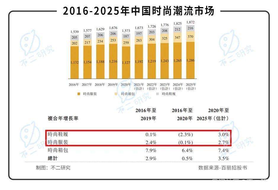 據弗若斯特沙利文數據顯示,2020年鞋履和服飾零售額分別為1870億元和11270億元,於中國時尚潮流市場零售總額佔比分別為11.9%及71.7%,預計2020年至2025年將分別以3.0%和2.7%的複合年增長率增長。
