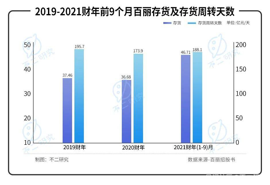同時,百麗還存在存貨壓力。2019-2020財年及2021財年前九月,其存貨分別為37.46億元、36.68億元和46.71億元,存貨週轉天數195.7天、173.9天和188.1天。