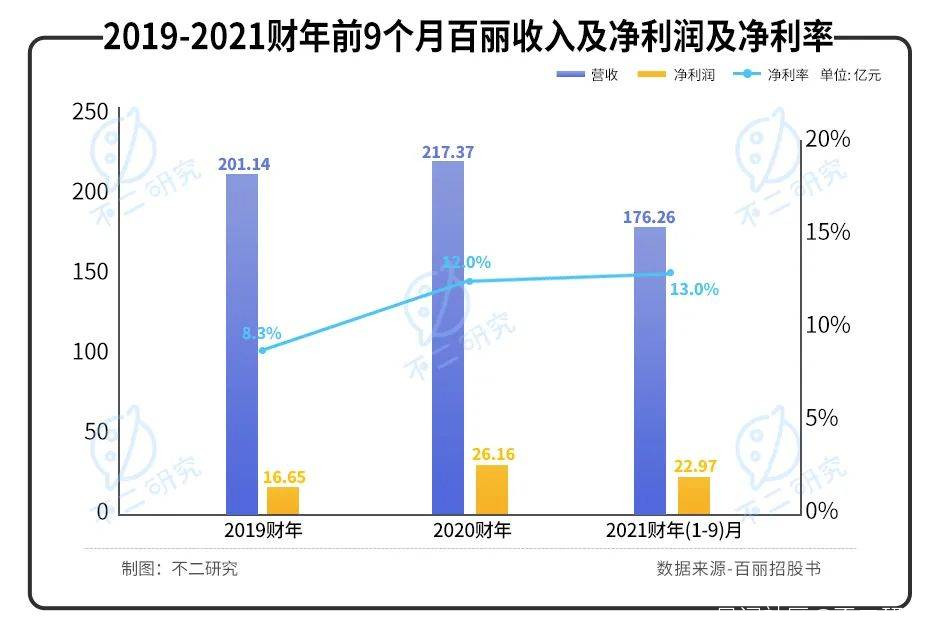 據招股書顯示,2019-2020財年及2021財年前九月,百麗的收入分別為201.14億元、217.37億元和176.27億元。淨利潤分別為16.65億元、26.16億元和22.97億元,淨利率8.3%、12.0%和13.0%。