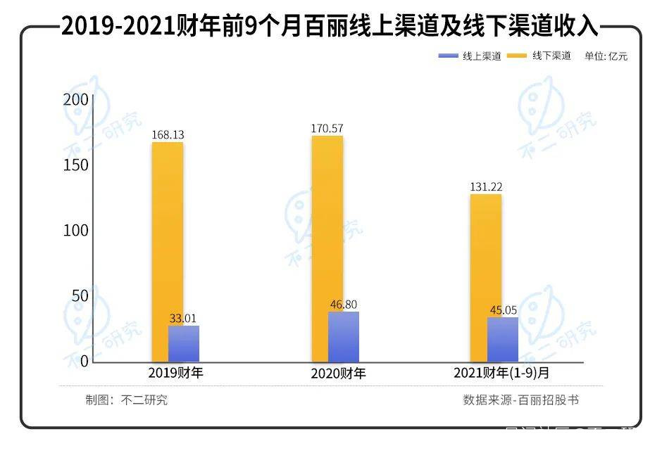 據招股書顯示,2019-2020財年及2021財年前九月,線下渠道收入分別為168.13億元、170.57億元和131.22億元,佔總收入的83.6%、78.5%和74.4%;線上渠道收入分別為33.01億元、46.80億元和45.05億元,佔總收入的16.4%、21.5%和25.6%。