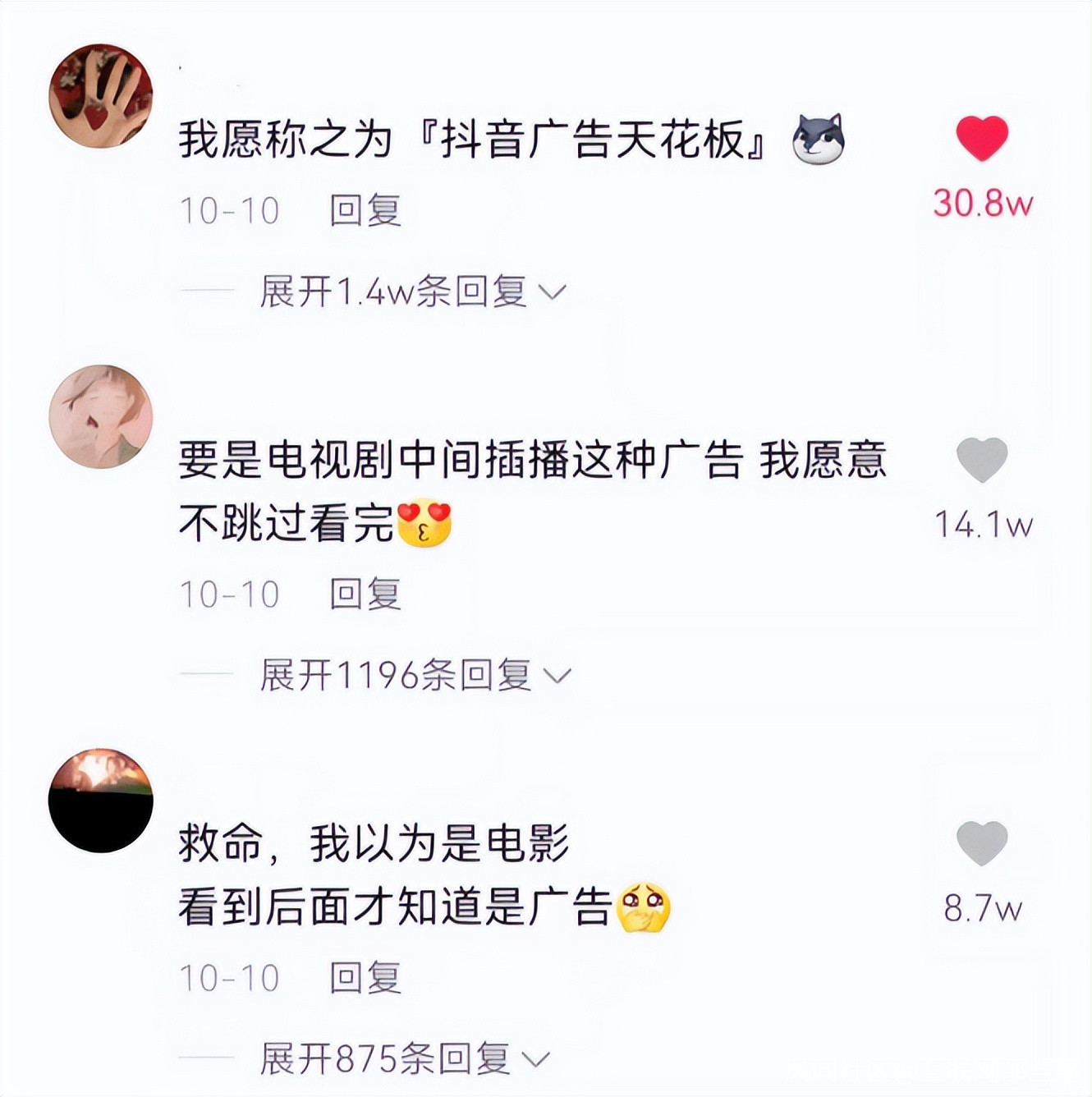 有網友評論稱這支廣告為“抖音廣告天花板”,同時這種新穎、有創意的廣告似乎成為了讓這屆年輕人愛看廣告的“特效藥”。