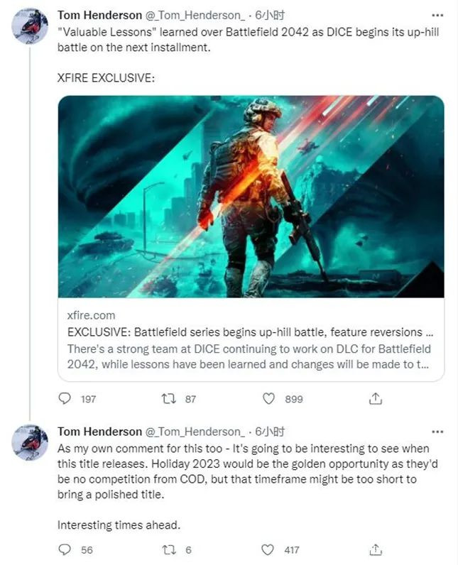 知名舅舅黨 Tom Henderson 爆料,EA 和 DICE 工作室仍然在完善《戰地2042》併為其開發 DLC,但該工作室的大部分成員已經在開發製作另一款《戰地》新作,同時 EA 也會為這款新作提供所需的資源以挽回系列口碑。
