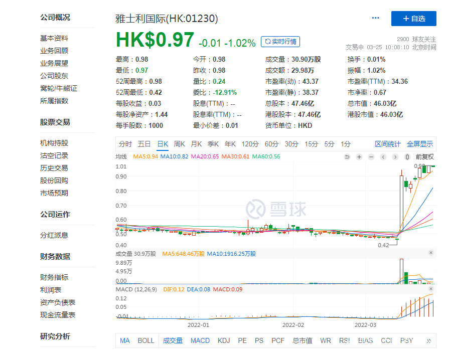 2013年11月20日,雅士利的股價達到歷史最高位,為5.32港元/股,而後就開始一路震盪下滑。截至3月24日,雅士利的股價為0.98港元/股,總市值為46.51億。而值得注意的是,該數值或許是雅士利停牌暴漲後的延續,畢竟在這之前雅士利的股價長年處於低位。