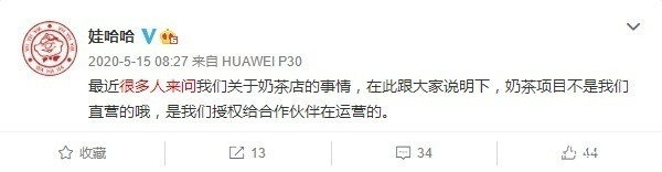 直到後來,娃哈哈才澄清稱, 奶茶項目確實不是娃哈哈的直營項目,而是授權給合作伙伴經營的項目。