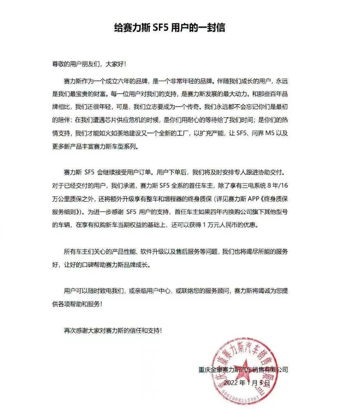 後續的維修保養如何保證?作為智能汽車核心系統升級服務怎麼保障?面對種種質疑,塞力斯品牌官方在1月5日發佈了《給賽力斯SF5用户的一封信》,聲稱將安排專人進行協助維護,並有繼續接受訂單的安排。