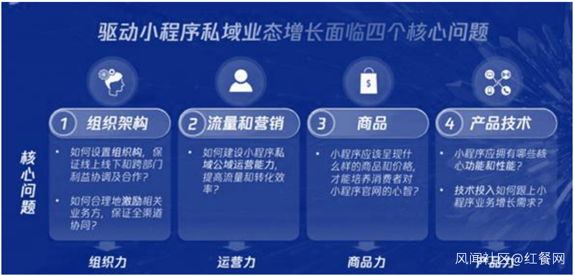 組織力即企業需結合自身的商業特徵,合理組織員工和不同部門,共同協作實現業務增長。商品力是在小程序上推出獨家產品、玩法來吸引消費者。運營力是通過增多觸點、分析運營數據等方式,提升流量轉化率。產品力即提供技術支持,以優化小程序的性能和使用感。