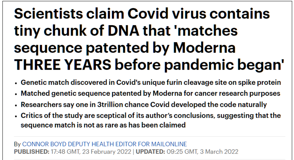 一是在Covid的furin酶切位點發現了刺突蛋白的基因匹配;這段匹配的基因序列與莫德納公司一項為癌症研究申請的專利一致;研究人員表示,新冠病毒自然合成有關的序列只有三萬億分之一的幾率。