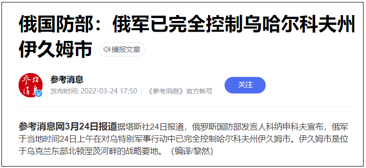 另外,昨天俄羅斯國防部發言人科納申科夫宣佈,俄軍於當地時間24日上午在對烏特別軍事行動中已完全控制哈爾科夫州伊久姆市——伊久姆市是位於烏克蘭東部北頓涅茨河畔的戰略要地,拿下它,哈爾科夫完全解放的時間就不會太久了。