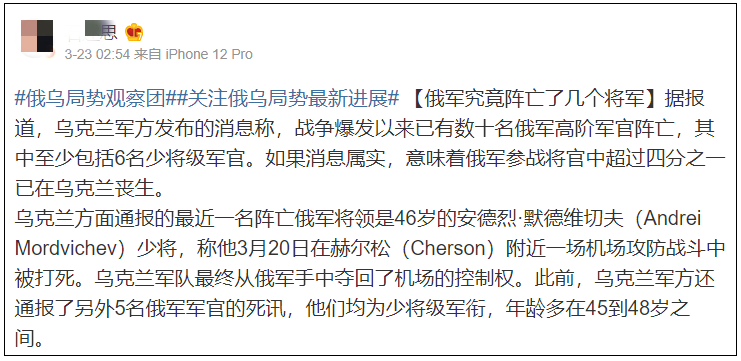 此外,還有一個比較大的謠言:俄烏戰爭爆發以來,已有數十名俄軍高階軍官陣亡,其中至少包括6名少將級軍官。