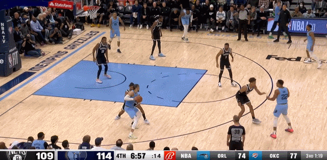 第四節尤為明顯,籃網的前4分鐘只得了5分——一個三分和一個高難度的突破一打三——全部來自歐文,比分已經被灰熊反超了。