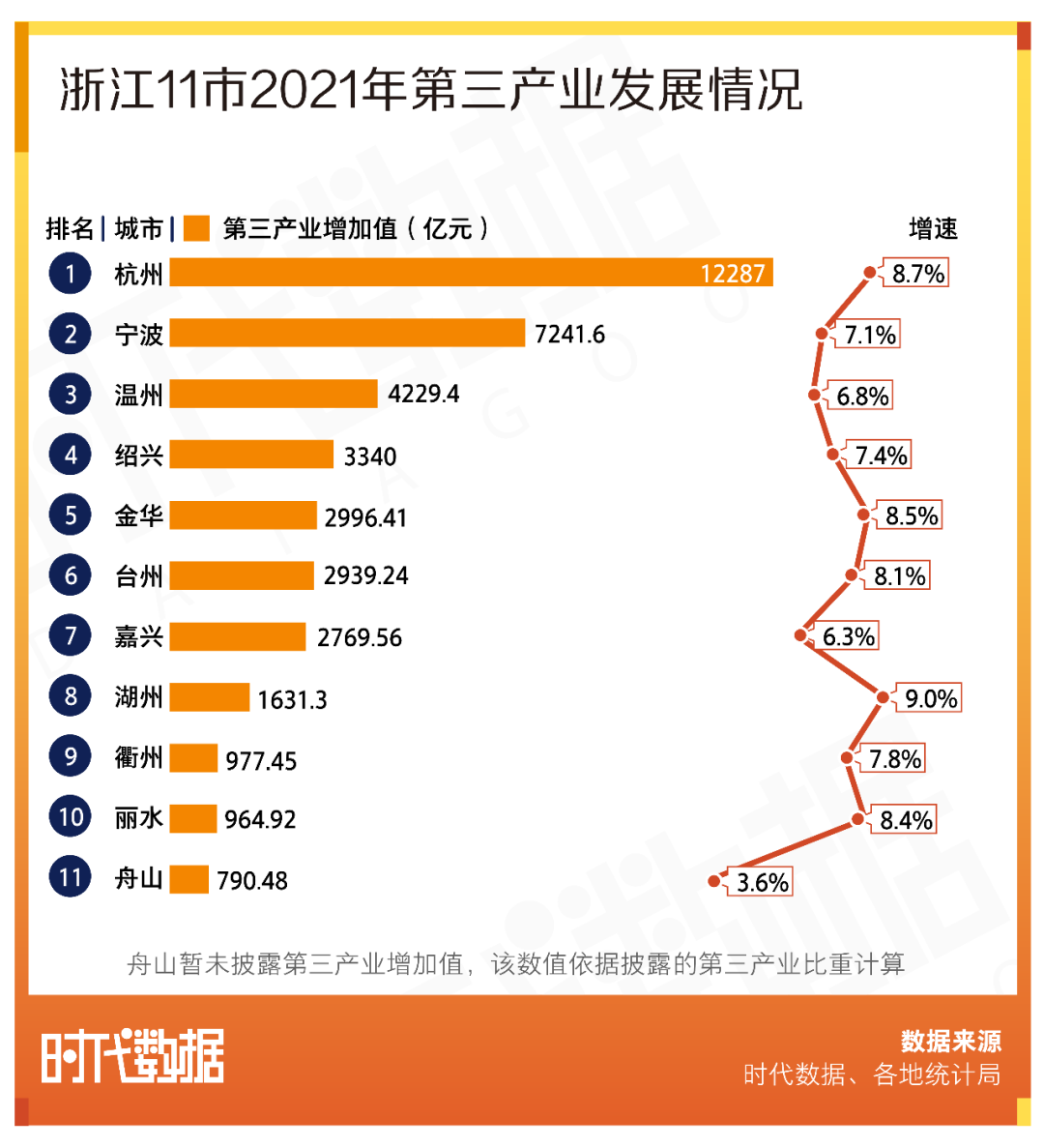 從第三產業增速來看,湖州位居第一,達到9.0%;其後,杭州、金華、麗水、台州增速均達到8%,分別為8.7%、8.5%、8.4%、8.1%。