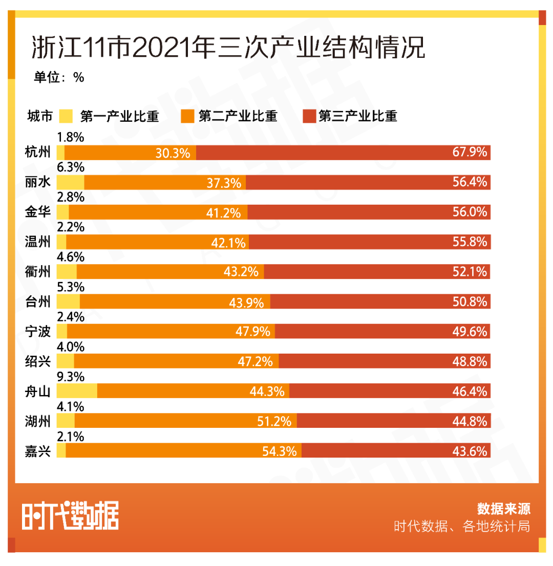 從第三產業比重來看,杭州第三產業比重最高,達到67.9%;其後,麗水、金華、温州、衢州、台州第三產業比重均超過50%。