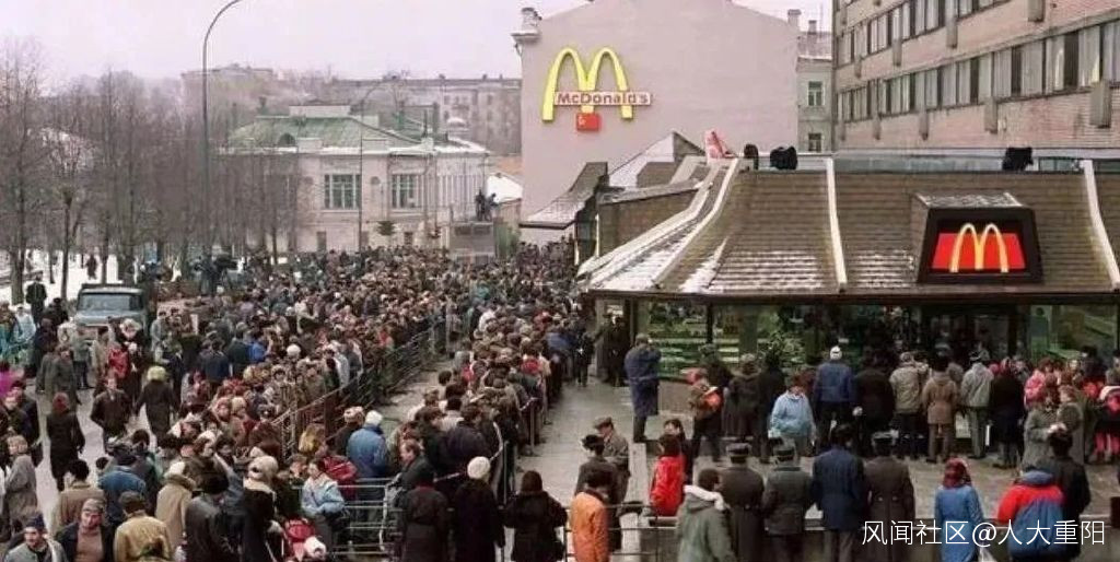 1990年1月31日,在經過14年的漫長爭取後,麥當勞終於在莫斯科市中心普希金廣場旁的黃金地段,開設了蘇聯的第一家門店。莫斯科人民用幾公里的長隊和熱切的目光迎接這個來自美國的“怪物”:巨無霸、炸薯條散發的是自由和繁榮的香甜,杯中可口可樂翻湧的氣泡,宛若迎接美好未來的璀璨禮花。