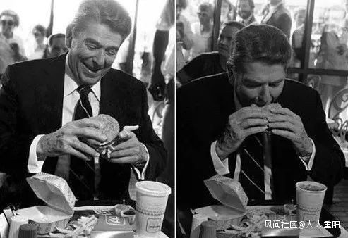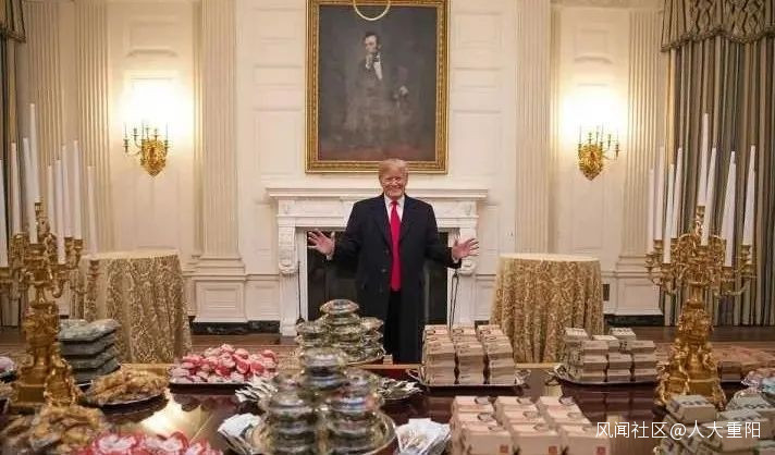 對美國前任總統特朗普來説,沒有什麼煩惱是一個巨無霸不能解決的,看起來簡直是像麥當勞請他付費代言似。在白宮、空軍一號和其他各種場合,你總能在特朗普的身邊看到吃完或者沒來得及吃的漢堡包紙盒,他甚至用壘得像小山一樣的麥當勞漢堡包和薯條,在白宮舉辦招待會。他對漢堡包的評價是:偉大的美國食品。