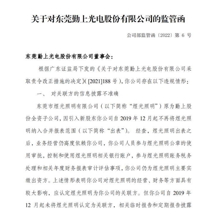 其中監管函顯示,原勤上股份全資子公司煜光照明出表後,勤上股份仍對煜光照明的經營、財務等方面具有較大影響,應認定煜光照明為其關聯方。但勤上股份自2019年12月起未將煜光照明認定為關聯方,相關臨時報告和定期報告披露的關聯方信息不準確、不完整。