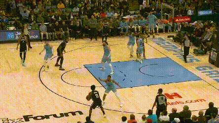 **籃網靠着雙星彼此照應,能快速解決問題,破解灰熊的防守。**灰熊從籃網持球人進入三分線開始,各種形式的協防一定伺候上。由於內線體型高大,全隊大部分球員移動能力出色,四號位小賈侖的移動護筐能力驚人,持球人深入籃下就等於陷入雙重險境,一是持球時間過久被灰熊下手搶斷,二是被封鎖傳球路線,導致被冒或失誤。一旦失誤,灰熊反擊成功率太高,造成攻防兩端一體的打擊。