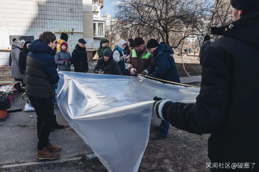 3月17日,人們在烏克蘭基輔領取用來遮擋窗户的塑料布。