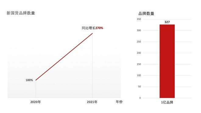 報告顯示,2021年,拼多多平台國貨品牌的入駐數量同比增長超過270%,並先後湧現出327個過億品牌,包括50多個過億的老字號品牌、30多個過億的新國潮品牌;入駐平台的國貨商品數量同比增幅遠超品牌數量(達到530%),國貨品牌的產品結構和創新動能呈現更高的增長勢頭。