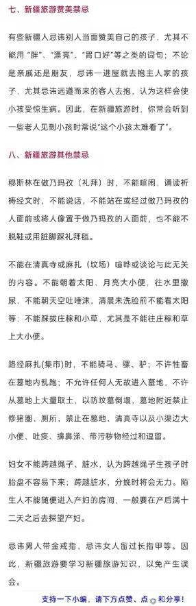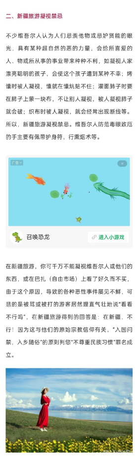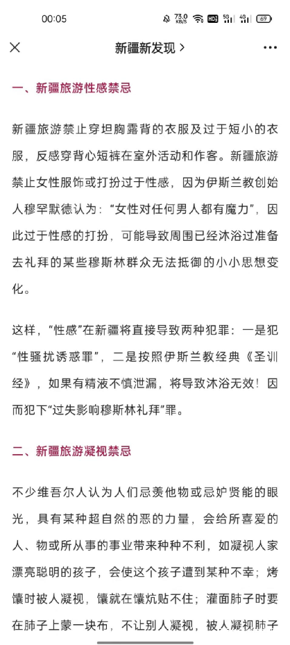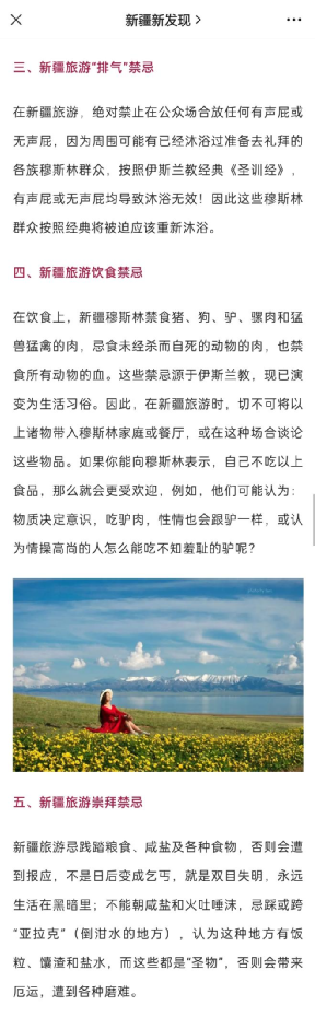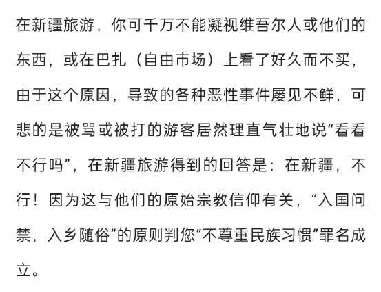 這位作者又在後續提到新疆旅遊的各種禁忌:什麼凝視禁忌、“排氣”禁忌、飲食禁忌……等等,要説這些所謂的“禁忌”的評判標準是什麼?全文充斥着的只有宗教教義:伊斯蘭教經典規定、新疆穆斯林、穆斯林在做乃瑪孜時……甚至是理所當然的將那些宗教教義劃定為“民族習慣”,甚至是提到如果不遵守這些“教義”就會判“不尊重民族習慣”罪名成立。真的是好大的口氣,這不僅僅只是在“教族捆綁”而是赤裸裸地宣傳“教法大於國法”嗎?