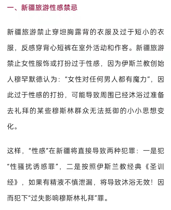 文章中提到的第一條禁忌就是“新疆旅遊性感禁忌”,這條“禁忌”的內容無非就是:在新疆旅遊時袒胸露背的衣服及過於短小的衣服……等等,要問為什麼禁止,這個作者就大言不辭地開始從宗教的角度評判,伊斯蘭教規定什麼什麼、穆罕穆德要求怎麼做,不知道的人以為這是來到了哪個中東穆斯林國家了,這種言論真的是讓人費解。然而筆者在批評這種“腦殘觀點”的同時,也想説明這種觀點也許不只是出現在文章當中,而是在現實生活中一些人真的存在着這樣的想法。