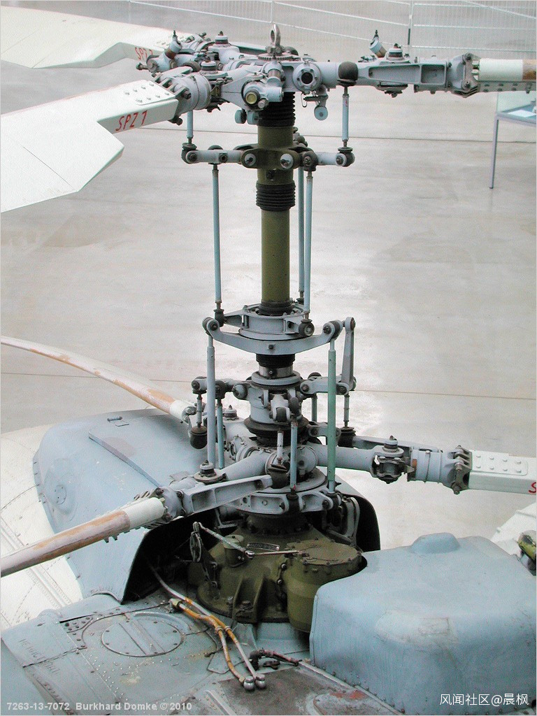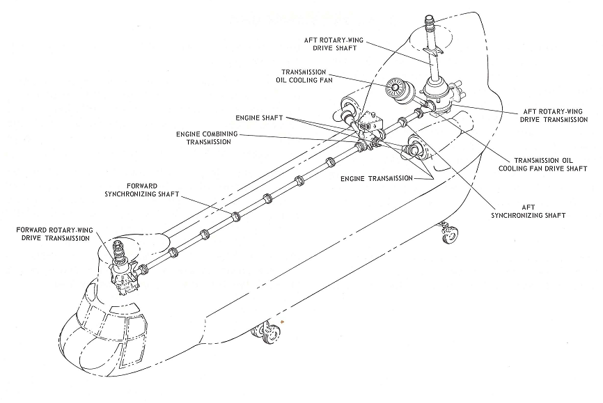 CH-47那樣的串列雙槳不僅有雙套滑盤、鉸鏈、連桿的問題,還需要把發動機的動力彙總後,用傳動-同步軸分配到前後旋翼,而不是兩台發動機分別驅動前後旋翼。只有這樣,才能保證前後旋翼同步。長長的大功率傳動-同步軸穿過整個機頂,這是又一個維修人員問候設計、製造方先人的地方。單旋翼-尾槳也有常常的傳動-同步軸,但功率一大,幺蛾子就多啊。