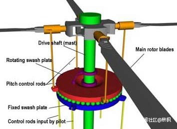 滑盤分上下兩部分,下滑盤是可在連桿控制下傾斜,但不轉動;上滑盤隨槳葉轉動,同時在貼面作用下“被迫”隨下滑盤傾斜,帶動連桿控制槳葉在旋轉中的上下揮舞,使得槳葉葉尖形成的軌跡(槳盤)傾斜,形成推力、側力等。