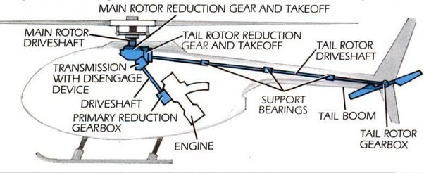 尾槳的動力從主旋翼減速器引出,長軸需要在中間有支承軸承,避免下垂和轉動時的抖晃,但增加磨損