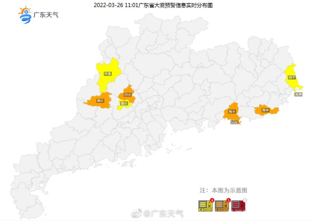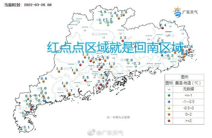 3月26日,粵北、珠三角市縣有大雨局部暴雨,其餘市縣陰天有中雨局部大雨。早晨最低氣温:粵北、粵東、珠三角中北部介於12℃~16℃,茂名、湛江介於20℃~22℃,其餘市縣16℃~19℃。